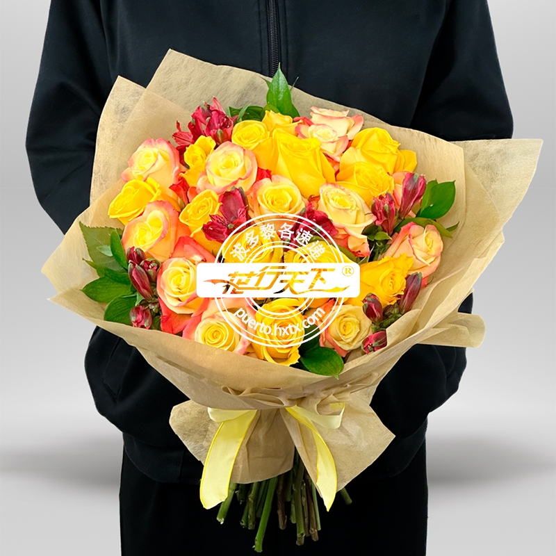 24枝黄玫瑰、六出花和时令绿叶组成、精美包装.