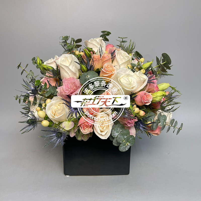 描述: 24枝玫瑰、绣球花、金丝桃、刺芹、迷你玫瑰和桉树叶组成、样式如图。
